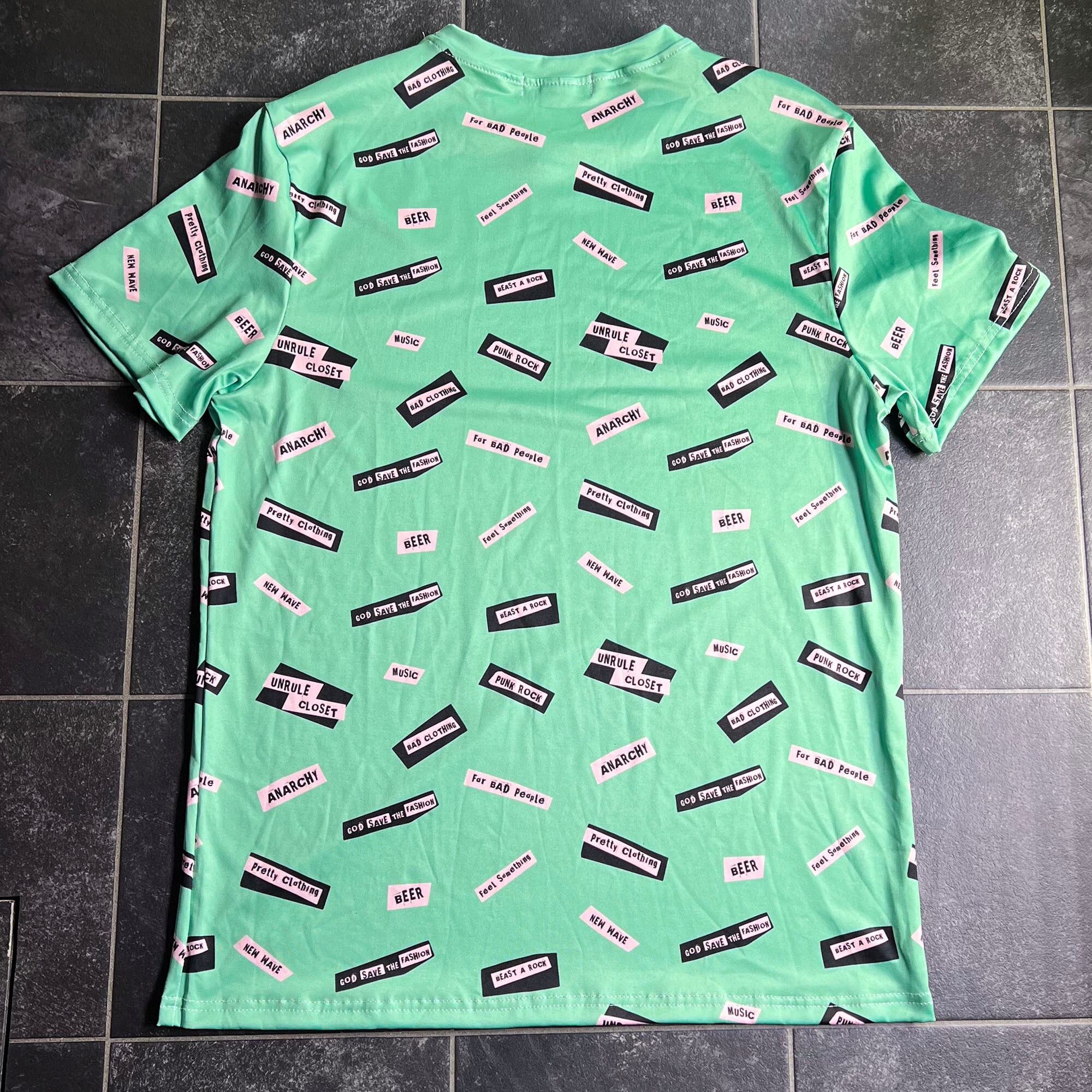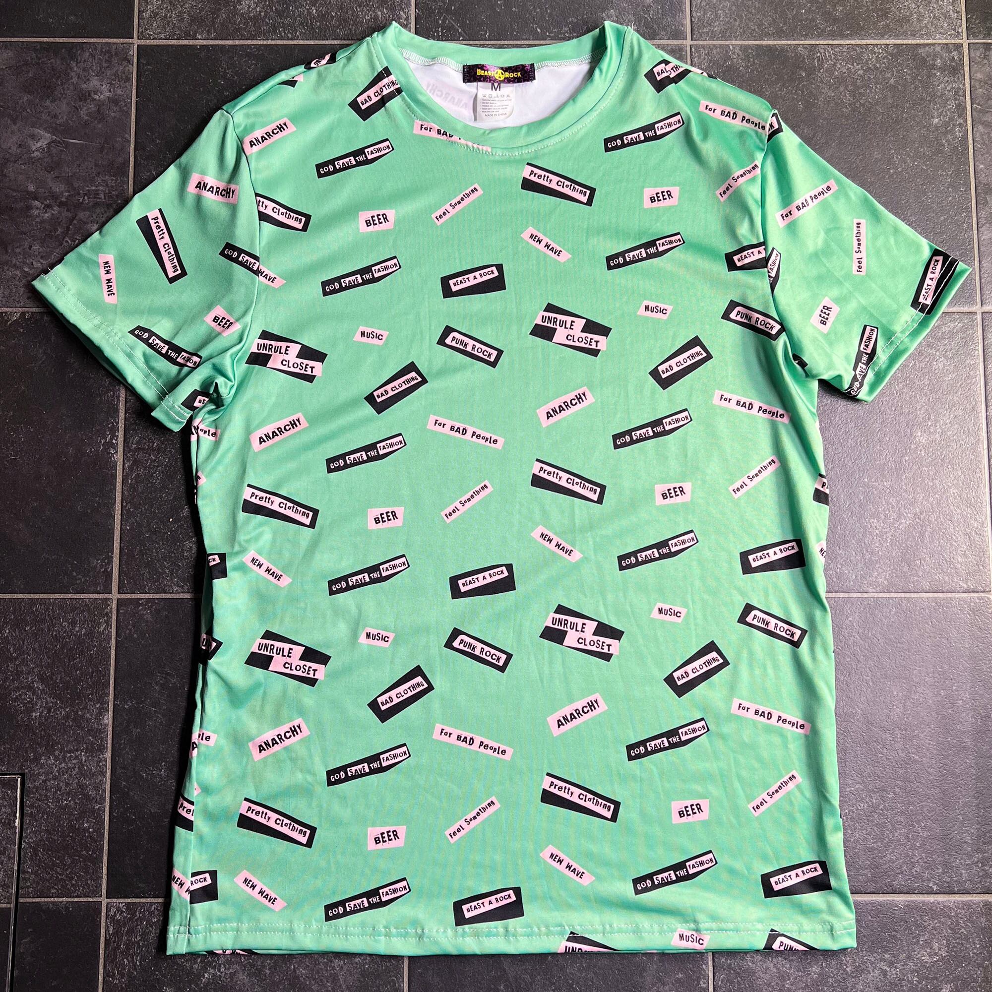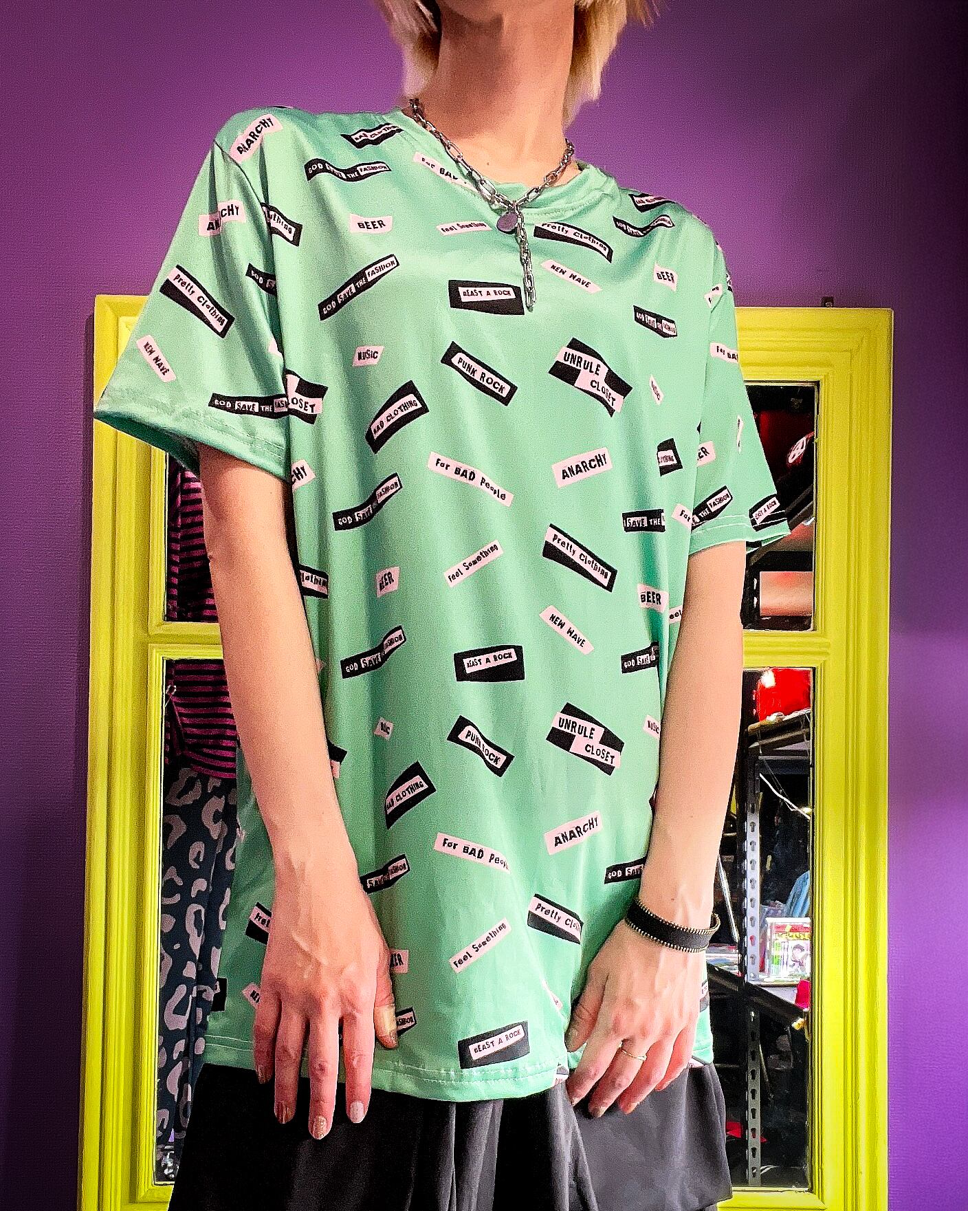 某有名パンクレコードの裏ジャケットをモチーフにした全面プリントカットソー。