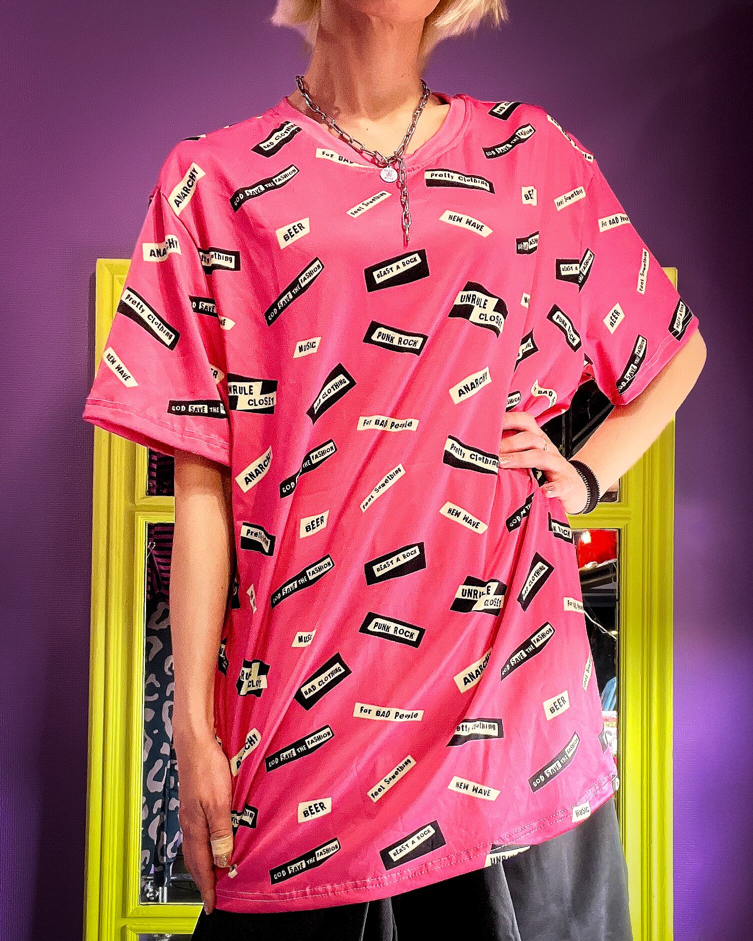 某有名パンクレコードの裏ジャケットをモチーフにした全面プリントカットソー。