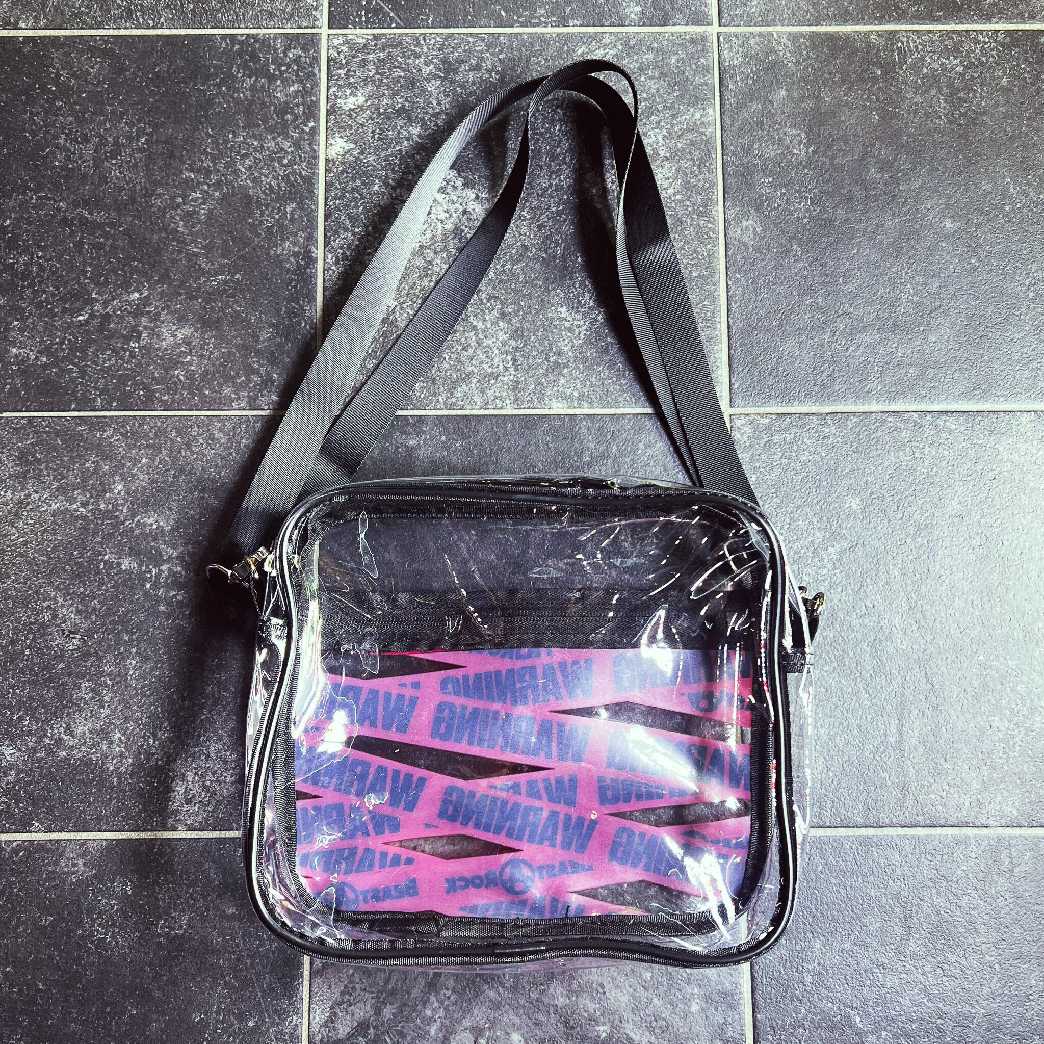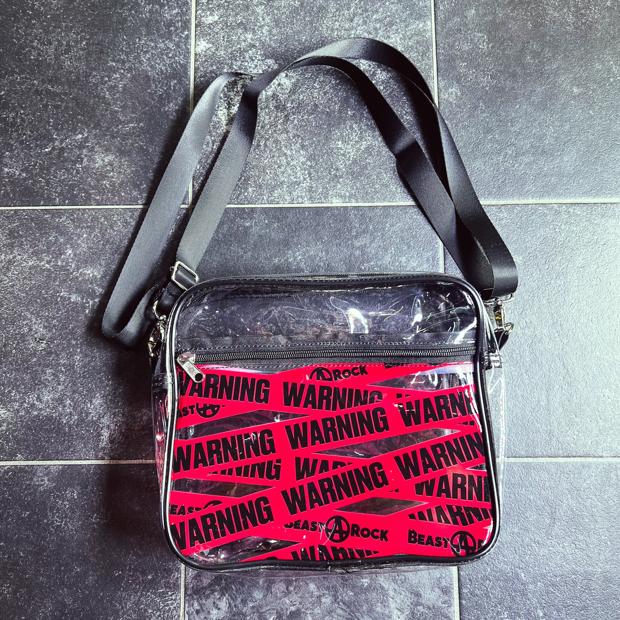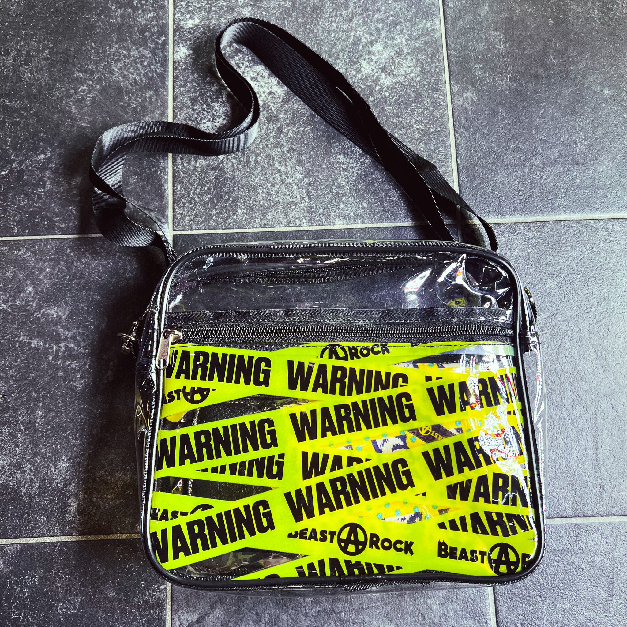 危険な物が入っているかのように、ビビッドな警告テープ風のグラフィックを前面にプリント。