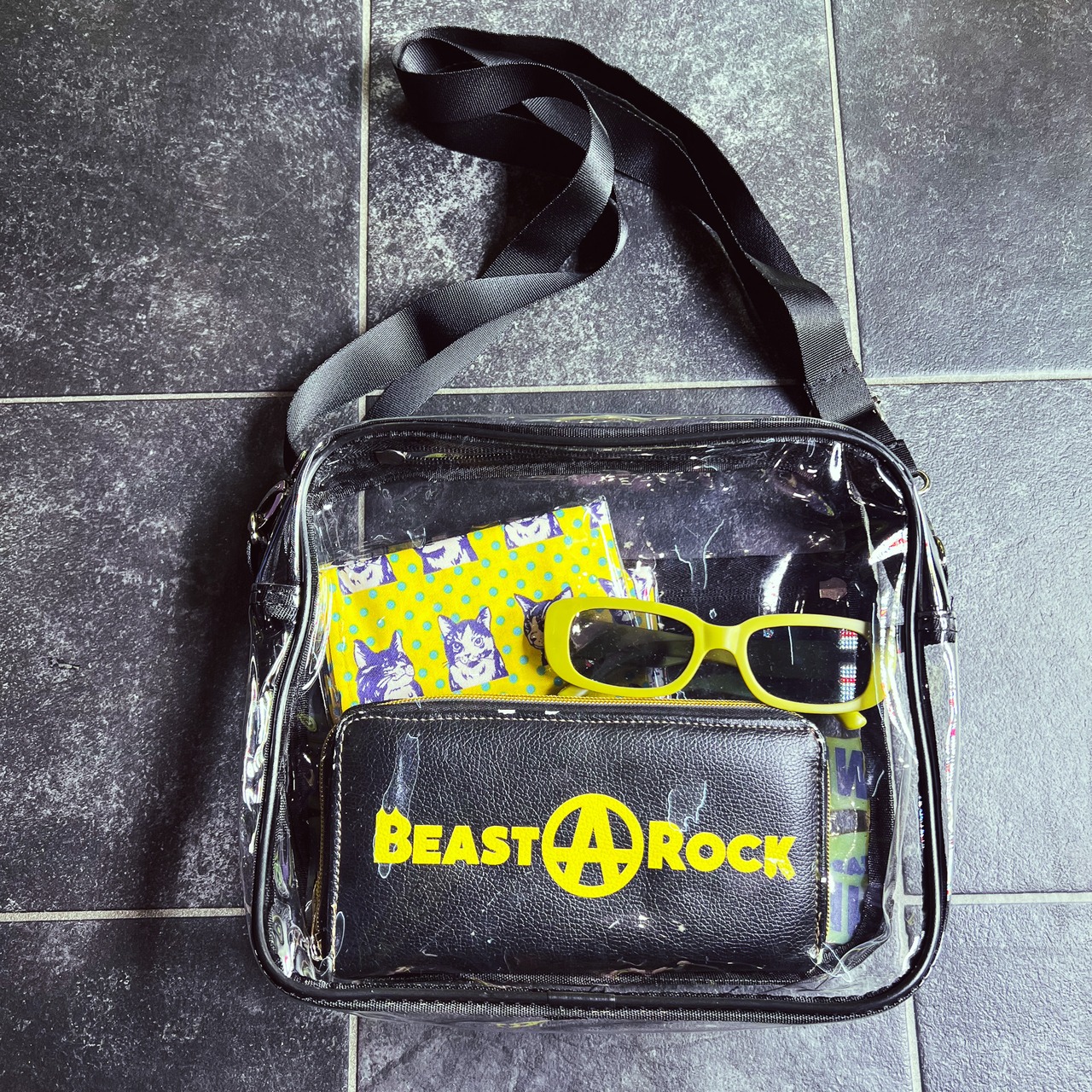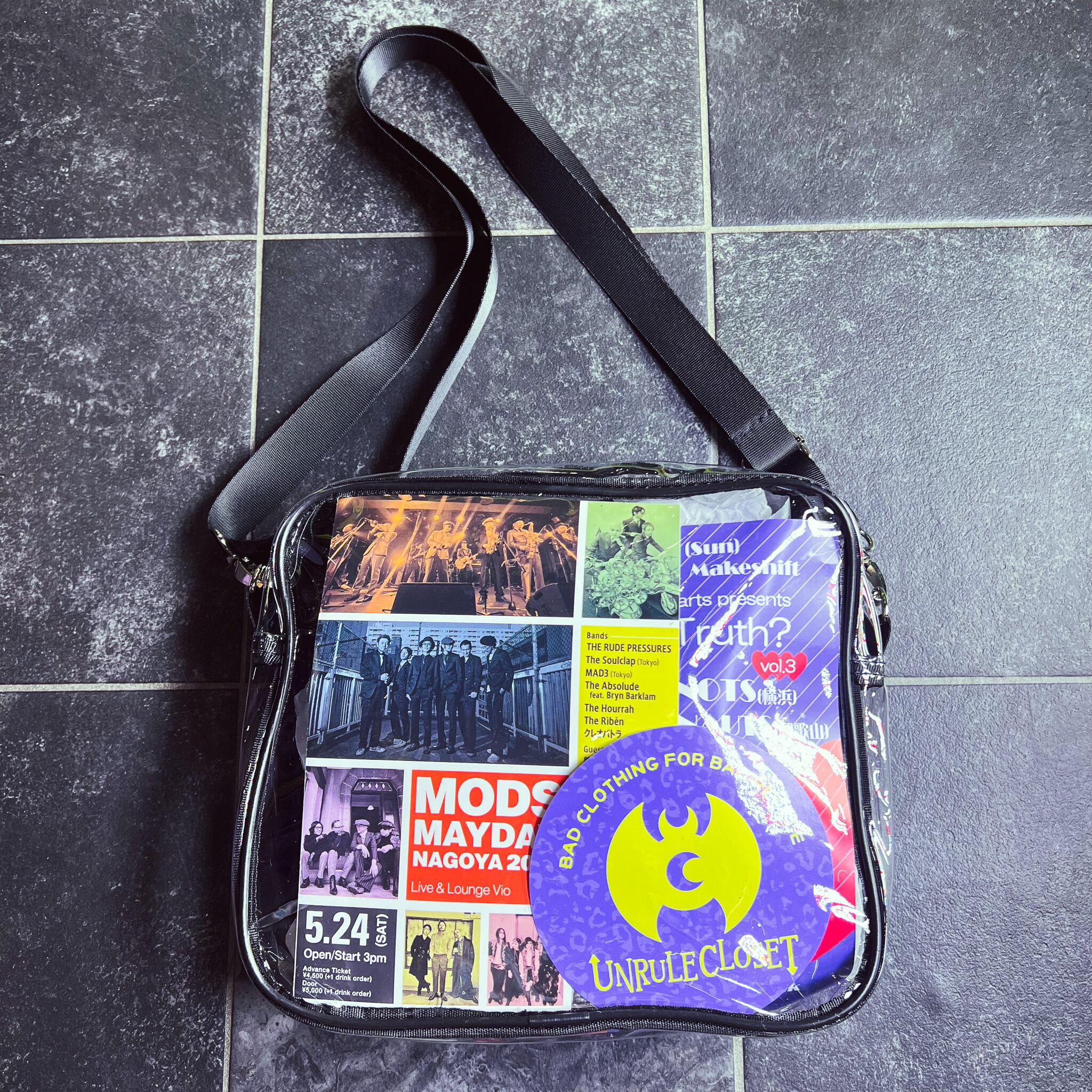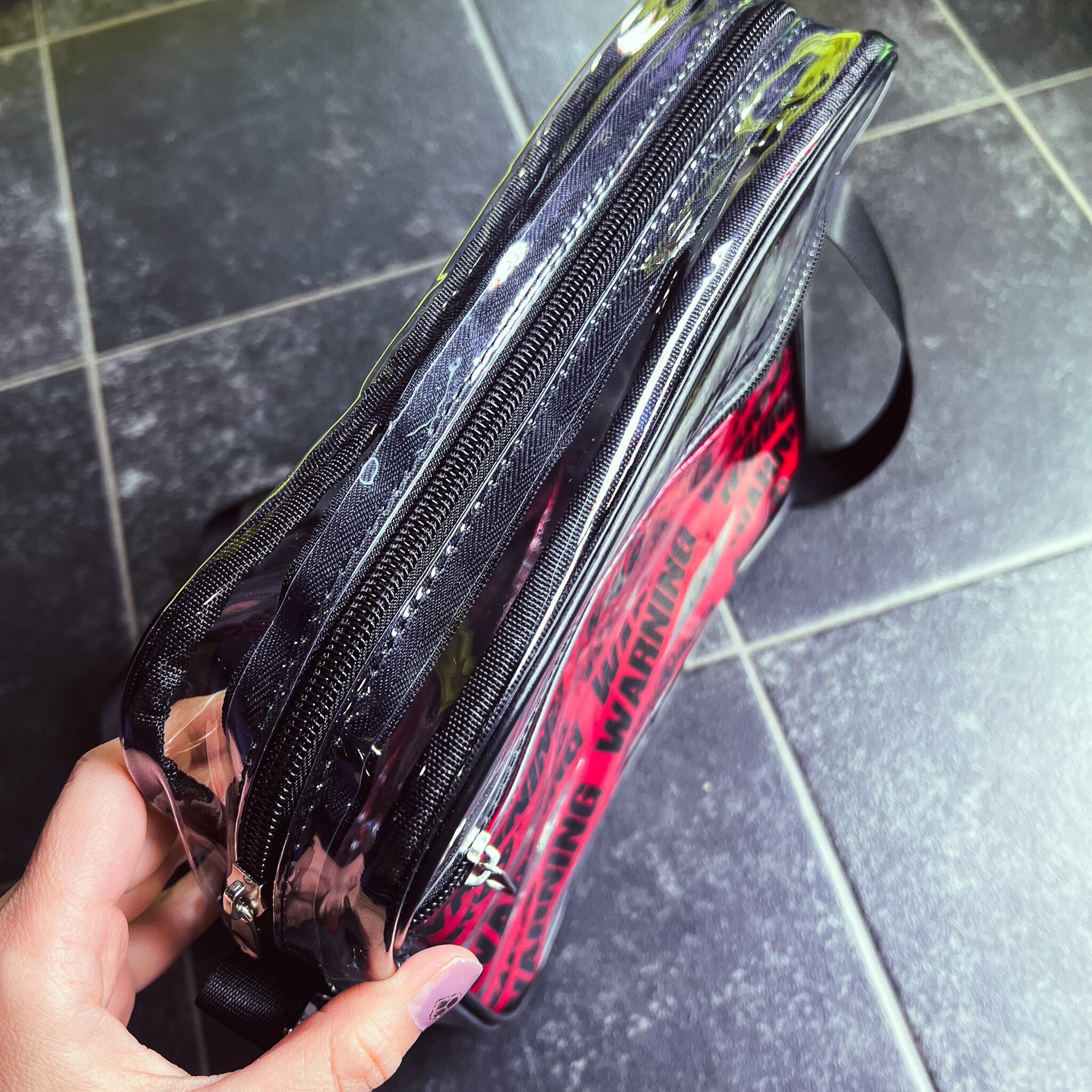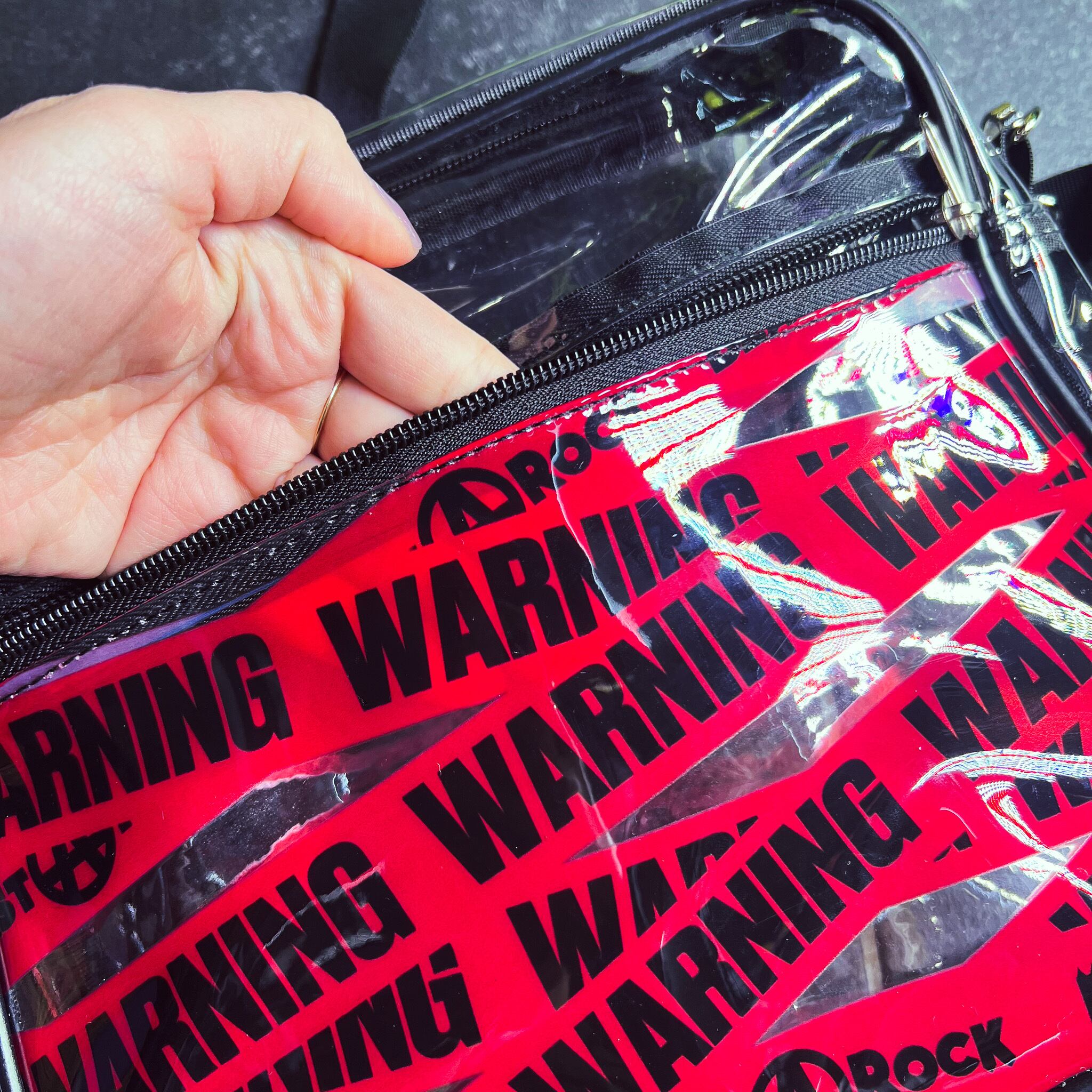 危険な物が入っているかのように、ビビッドな警告テープ風のグラフィックを前面にプリント。