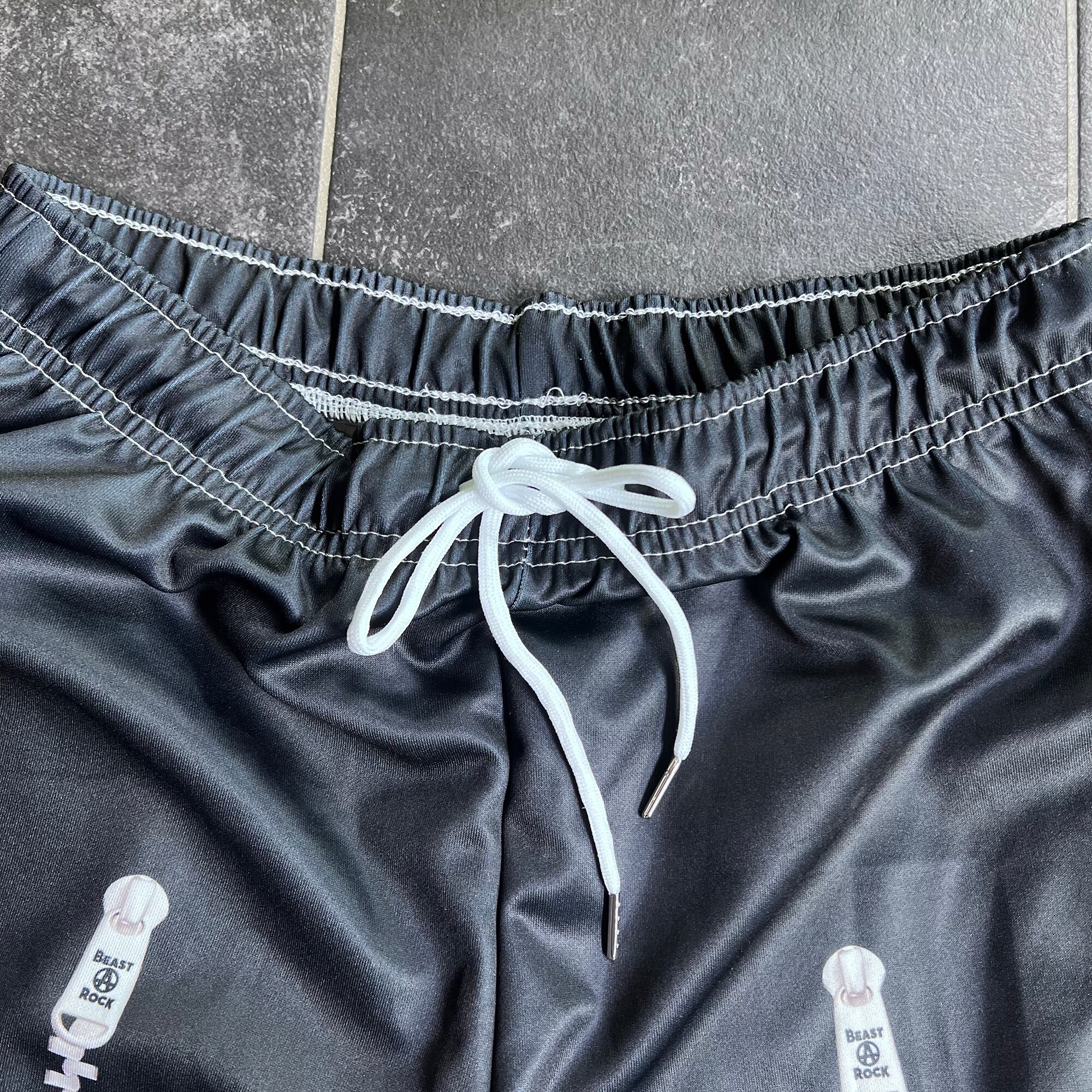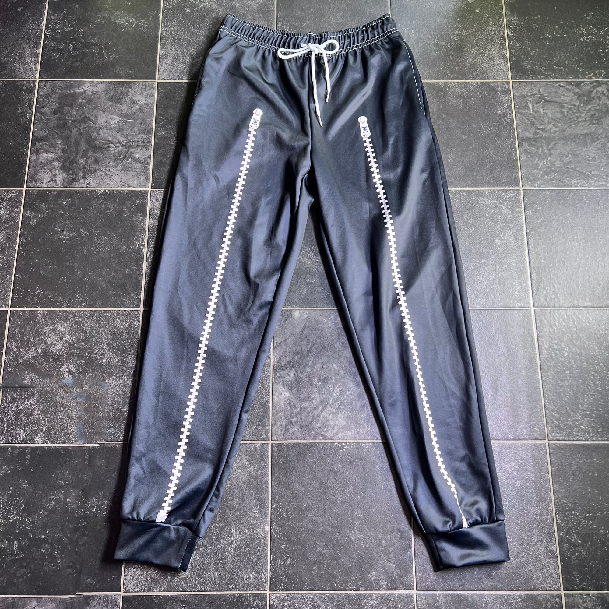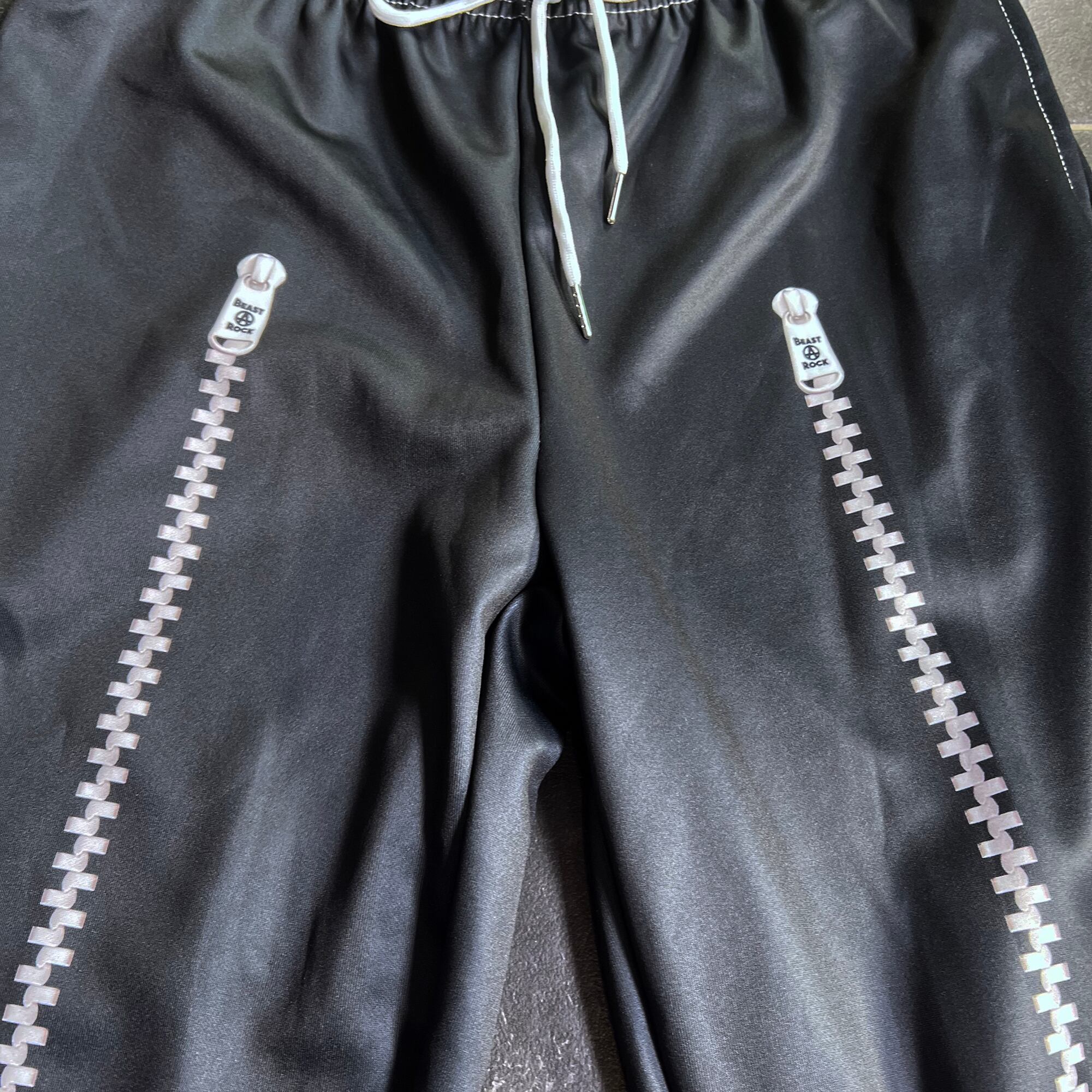 両面にジッパーのプリントを施したスウェットパンツ。