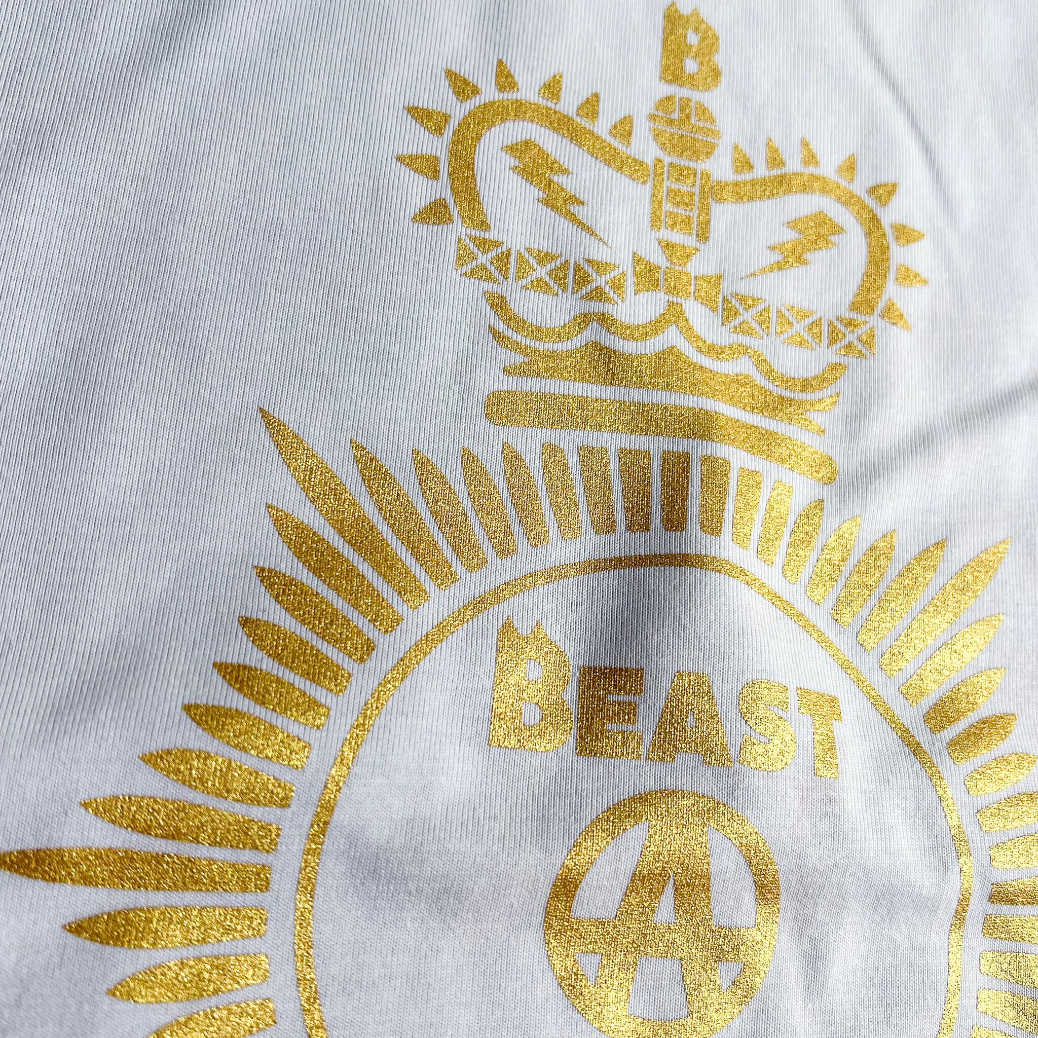 6.5オンス の厚手の生地とゴールドのメタリックプリントで高級感を演出。
