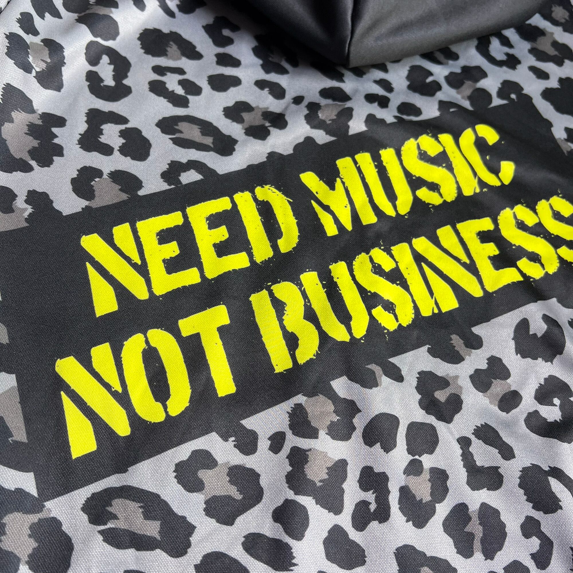 背中には『NEED MUSIC, NOT BUSINESS』(商業的なものはいらない。欲しいのは音楽だ)の文字がプリントされ、本物の音楽好きへのメッセージを込めたデザイン。