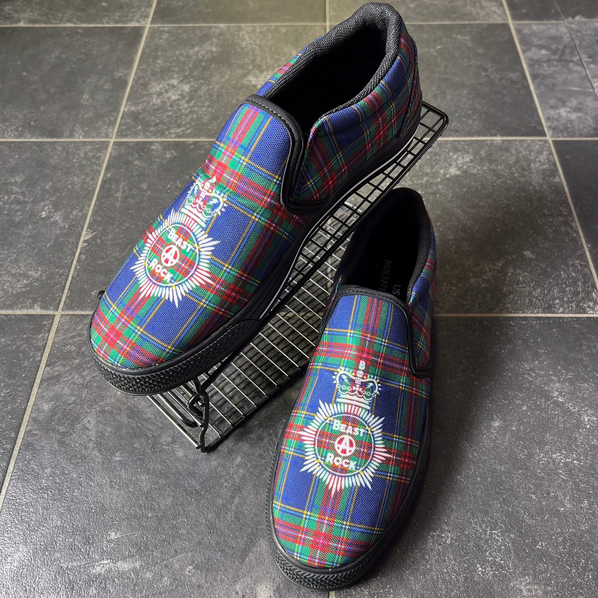 クラシックなタータンチェックに、BEAST A ROCKのエンブレムを大胆に配置したスリッポン。