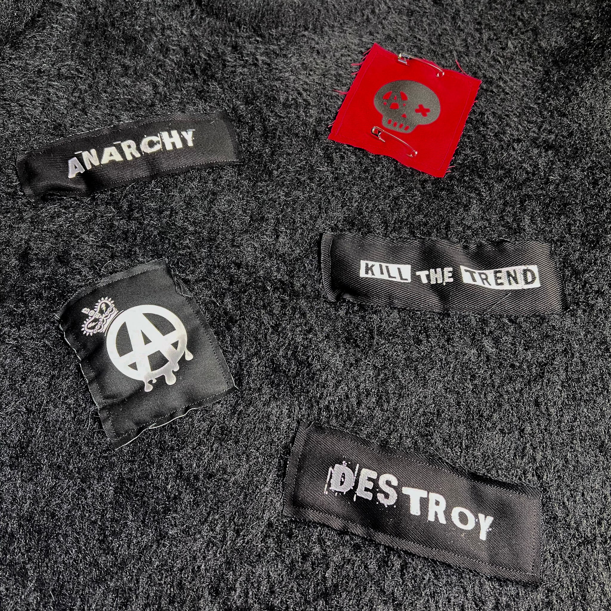 安全ピンで留めた布パッチや、ラフに切りっぱなしで仕上げたスローガンワッペンなど、