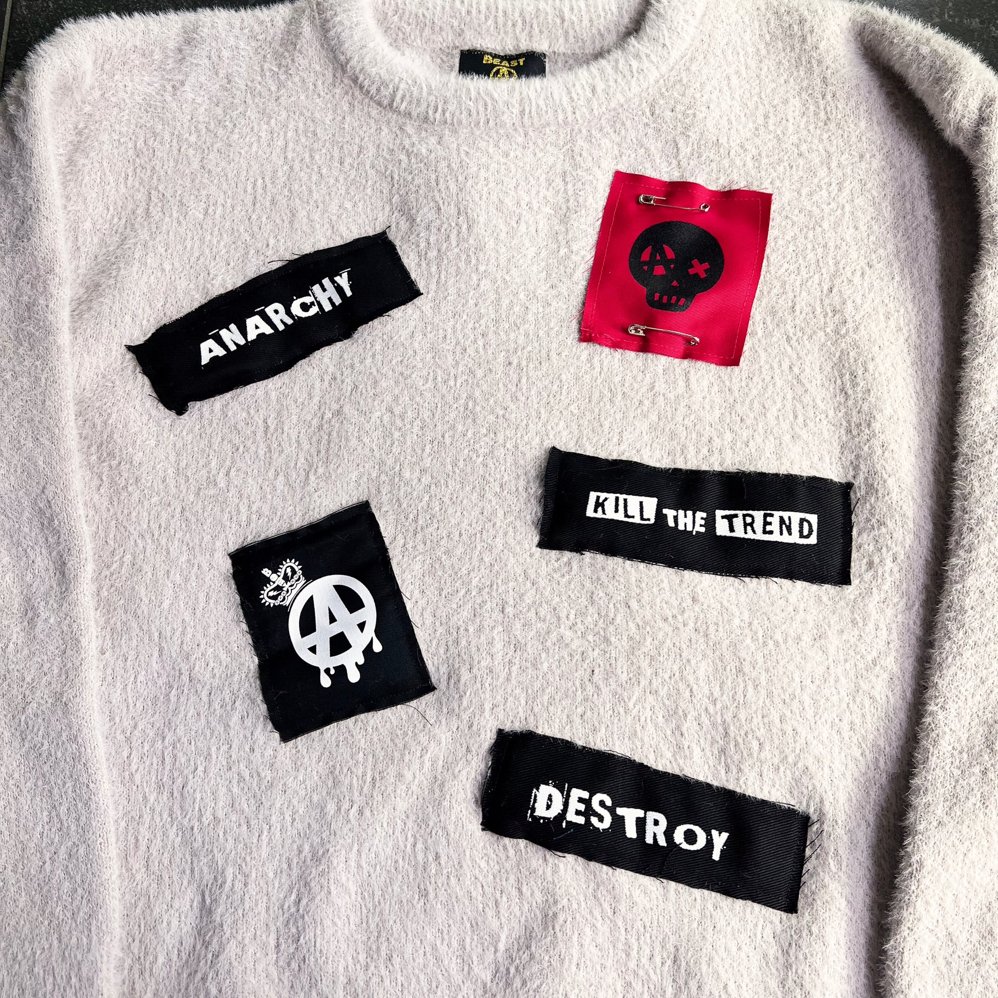 安全ピンで留めた布パッチや、ラフに切りっぱなしで仕上げたスローガンワッペンなど、