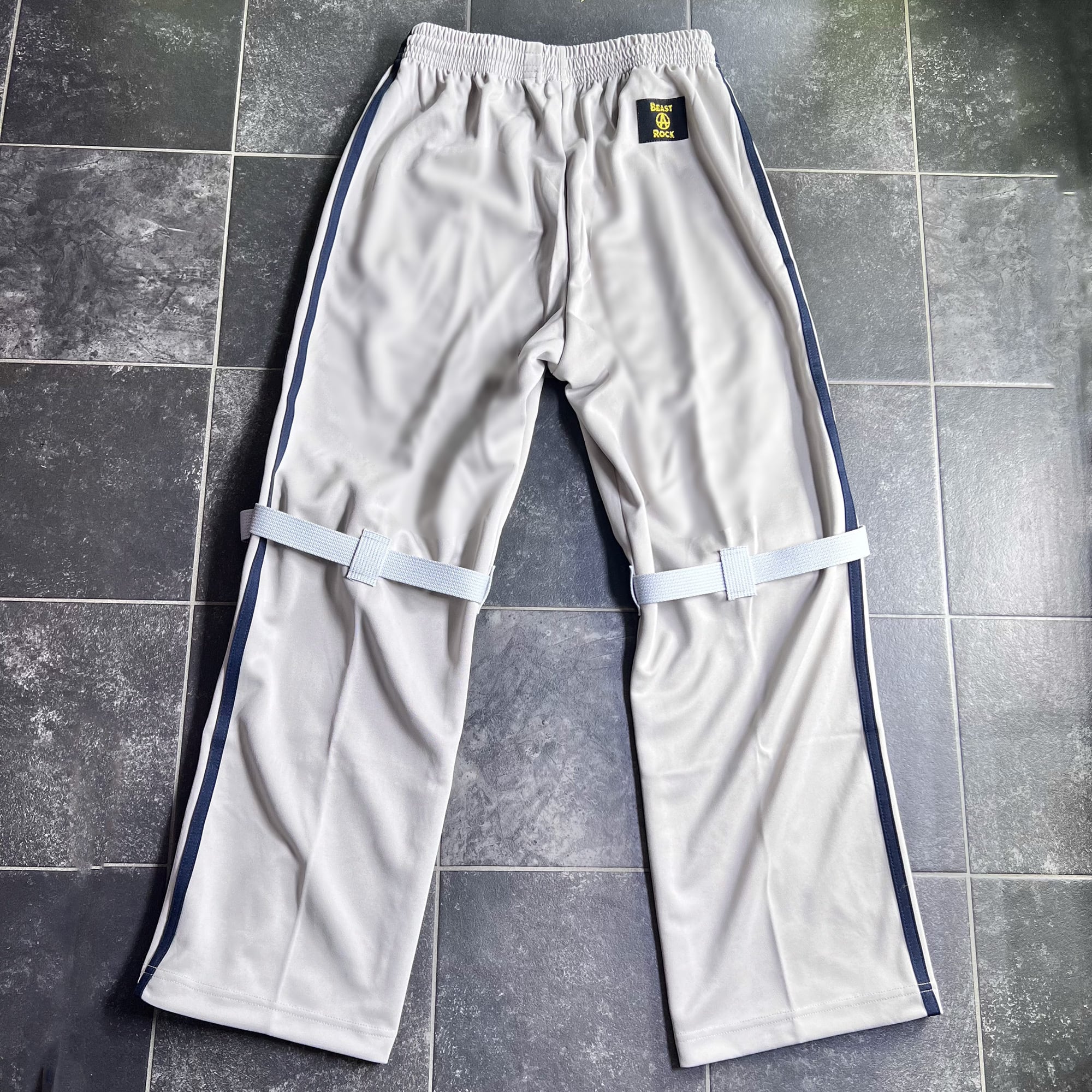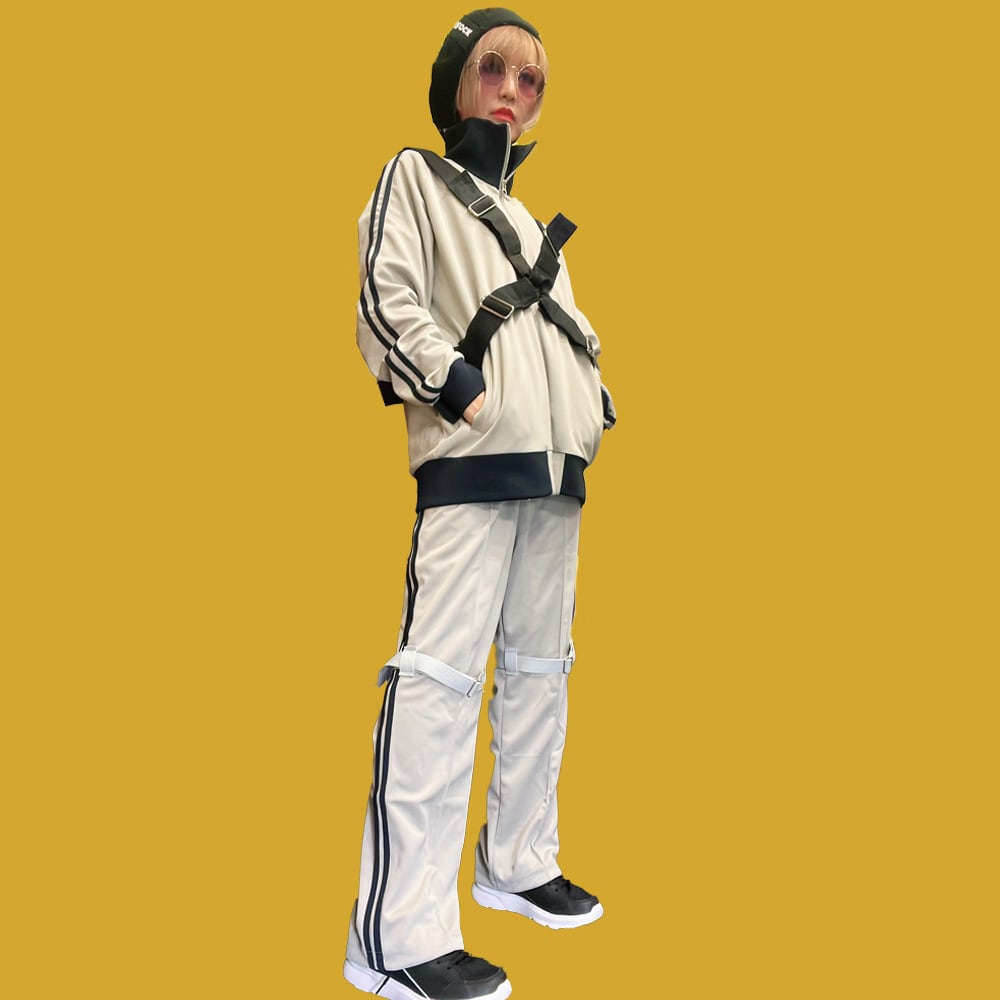 トラックパンツにボンテージパンツのニュアンスを落とし込みました。