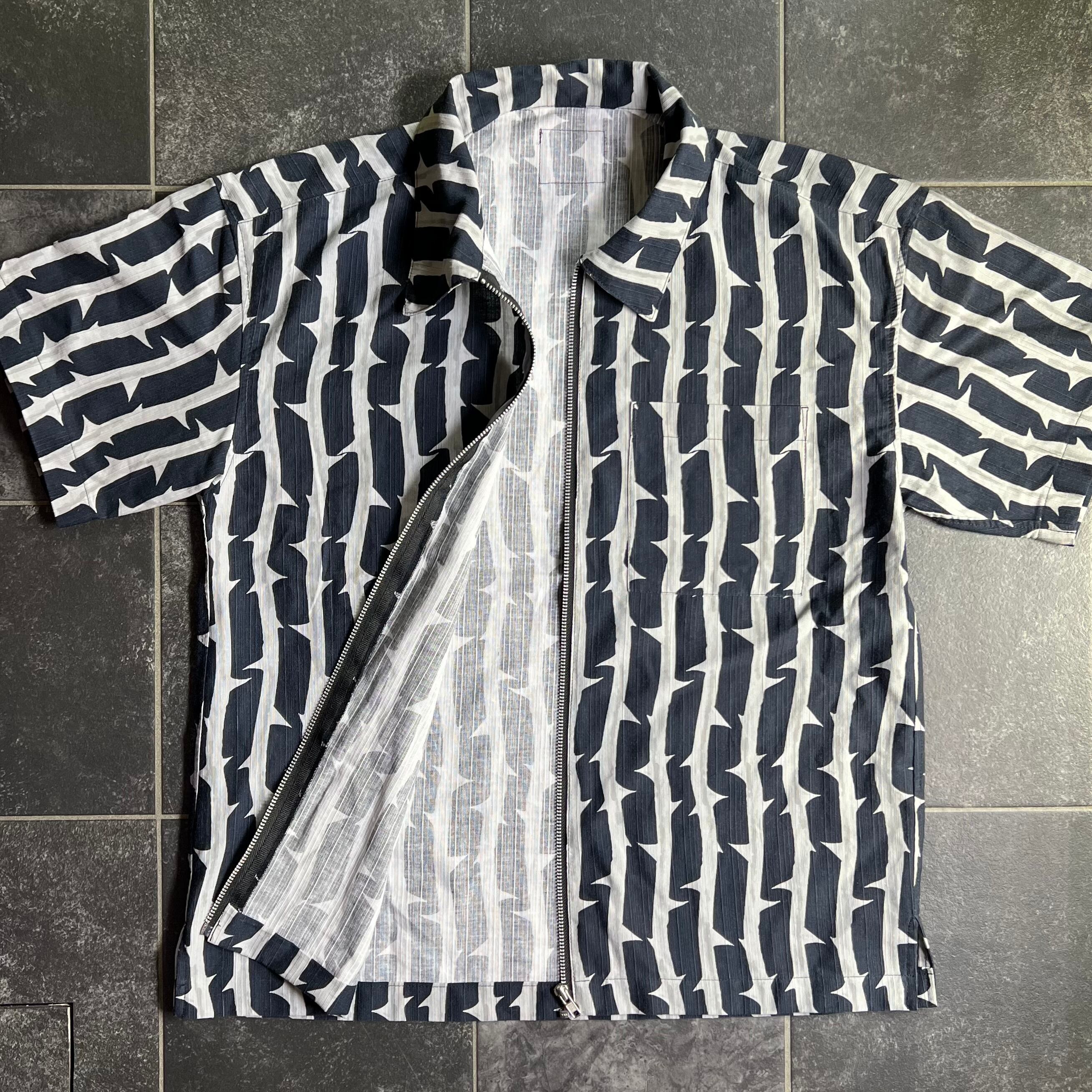 薔薇のトゲをストライプにプリントしたオリジナル生地のジップアップシャツ。