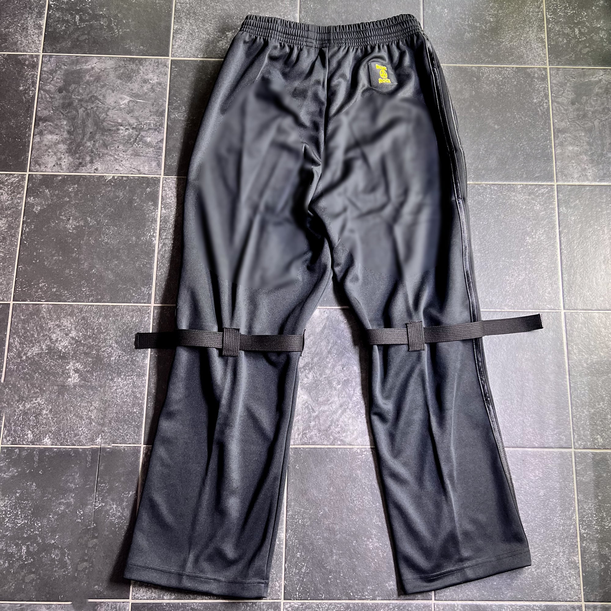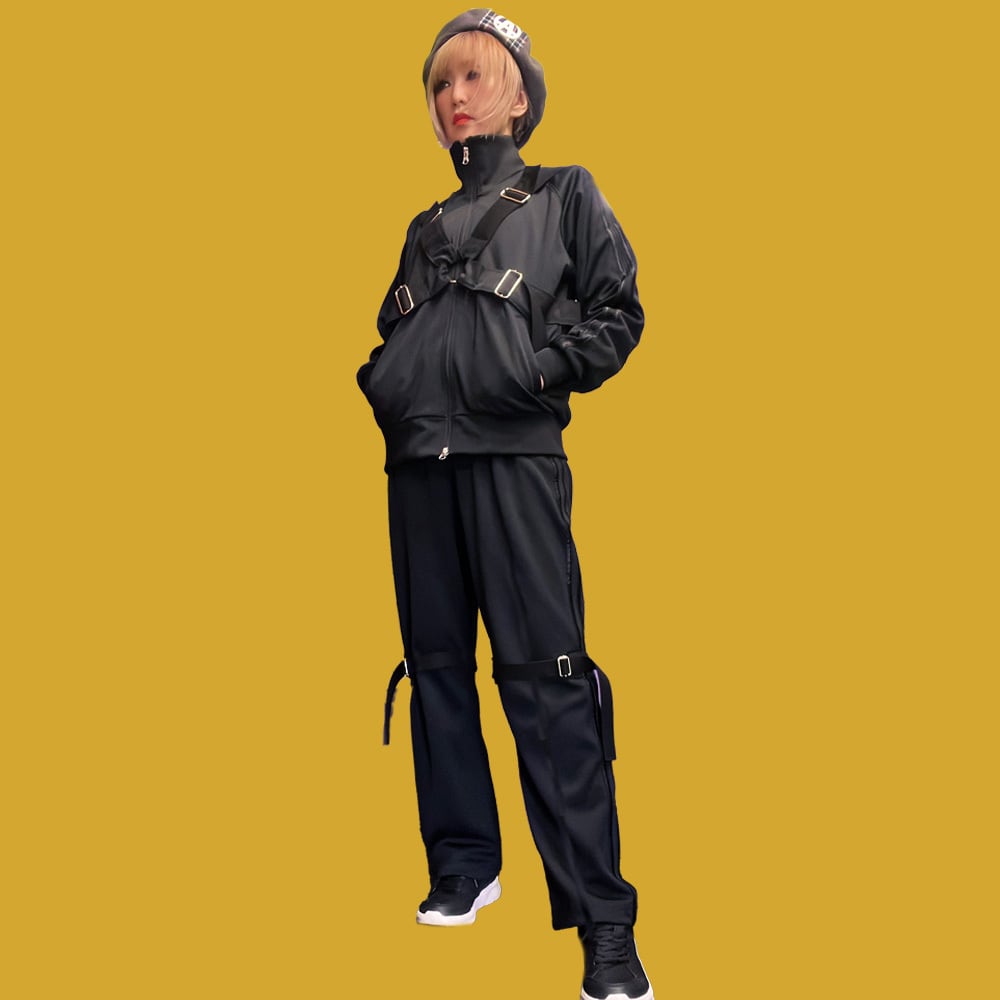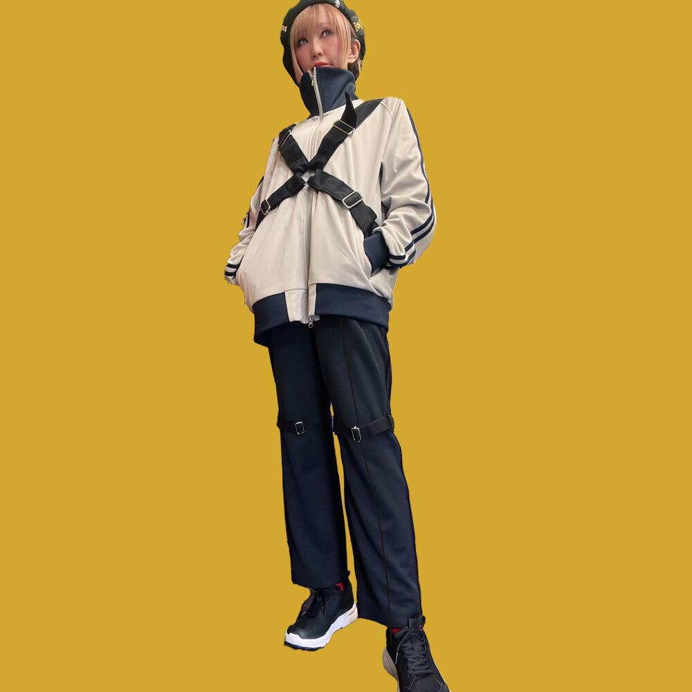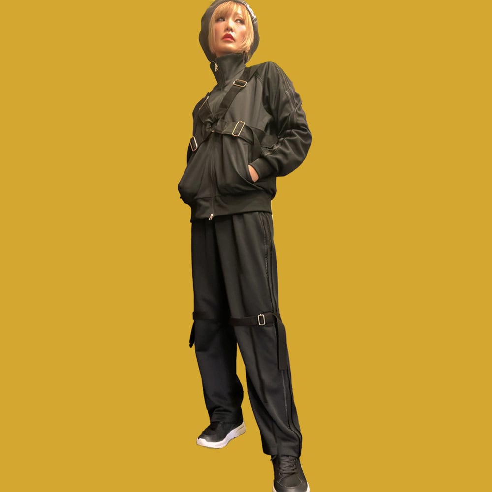 トラックパンツにボンテージパンツのニュアンスを落とし込みました。